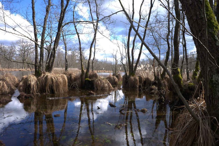 Hier leben große Herden von Rothirschen, die perfekt an das ständige Auf und Ab des Wassers in den Feuchtgebieten angepasst sind. Ihre Kälber lernen bereits in jungen Jahren, wie sie breite Strömungen überqueren und trockenes Land erreichen können. Wildschweine graben geschickt saftige Süßwassermuscheln aus dem Schlamm von Pfützen. Im Frühling, wenn die ersten Regenfälle die Wiesen mit Wasser durchtränken, tauchen unzählige Moorfrösche auf, um Tümpel und Pfützen zu besetzen, die sich im Sonnenschein schnell erwärmen. Die Männchen nehmen einen leuchtend blauen Farbton an, um potenzielle Partnerinnen zu beeindrucken. Spezialisierte Vogelarten wie der Wiedehopf und der Ziegenmelker ziehen ihre Jungen in sorgfältig ausgewählten Lebensräumen auf. Der Wiedehopf siedelt sich in sonnenbeschienenen Lichtungen an, während der Ziegenmelker den Schatten des Waldes bevorzugt. Kormorane übernehmen ganze Inseln für ihre Kolonien und unzählige Reiherarten bauen ihre Nester in Gebieten, wo Sümpfe, Kanäle und Seen eine Fülle an Fischen bieten.